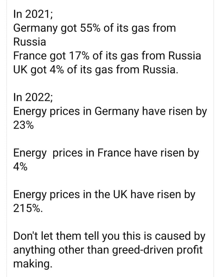 The image claims that in 2022 energy prices have risen in Germany by 23 per cent, in France by four per cent, and in the UK by 215 per cent.