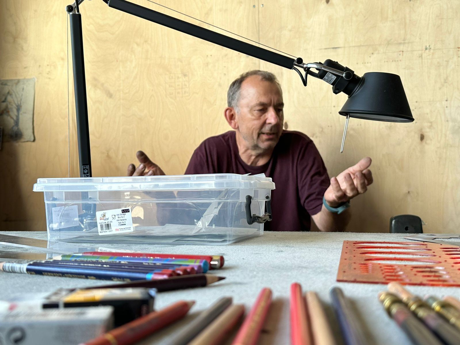 Ivanova offers to drive us from the gallery to the studio of one of Ukraine’s most celebrated artists, Pavlo Makov, who represented Ukraine at the 2022 Venice Biennale. While we chat, surrounded by artist tools and books, the sirens start to wail outside, a howling reminder how the threat of this war is never far away.