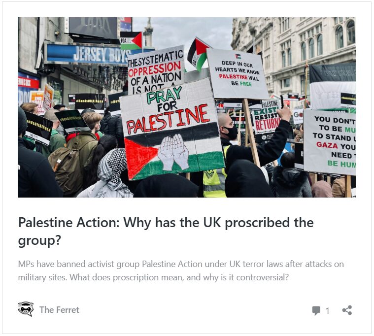 On 30 July Palestine Action co-founder Huda Ammori was granted permission to challenge the ban. Last weekend more than 500 people were arrested at a demonstration in London for showing support for the group – believed to be the largest number of arrests under terrorism powers in British history.