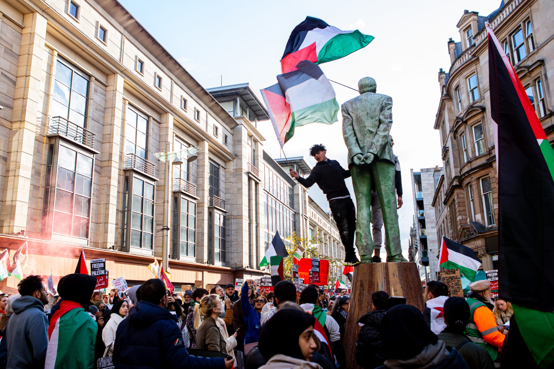 On October 21, 2023, a protester climbs atop the Donald Dewar statue at the bottom of Buchanan Steps in Glasgow, where thousands have gathered for a pro-Palestinian demonstration.