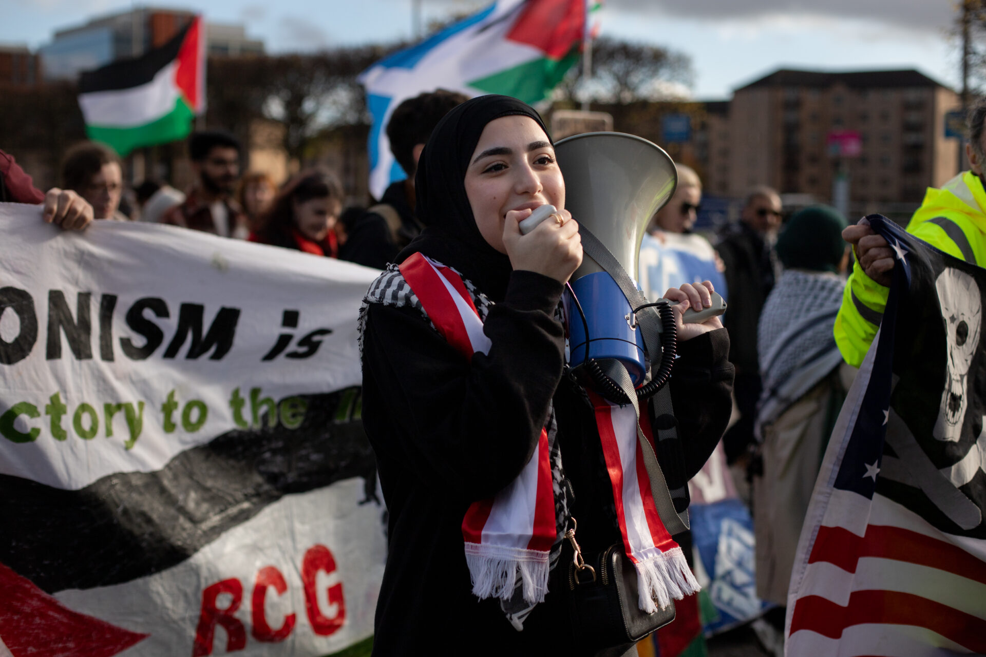 Zahara, a young Lebanese activist, leads a chant during a pro-Palestinian march toward the BBC building in Glasgow on October 26, 2024. Reflecting on the recent escalation in Lebanon in September, Zahara remarked: “We had a feeling it was coming but seeing my family affected has been so hard.”