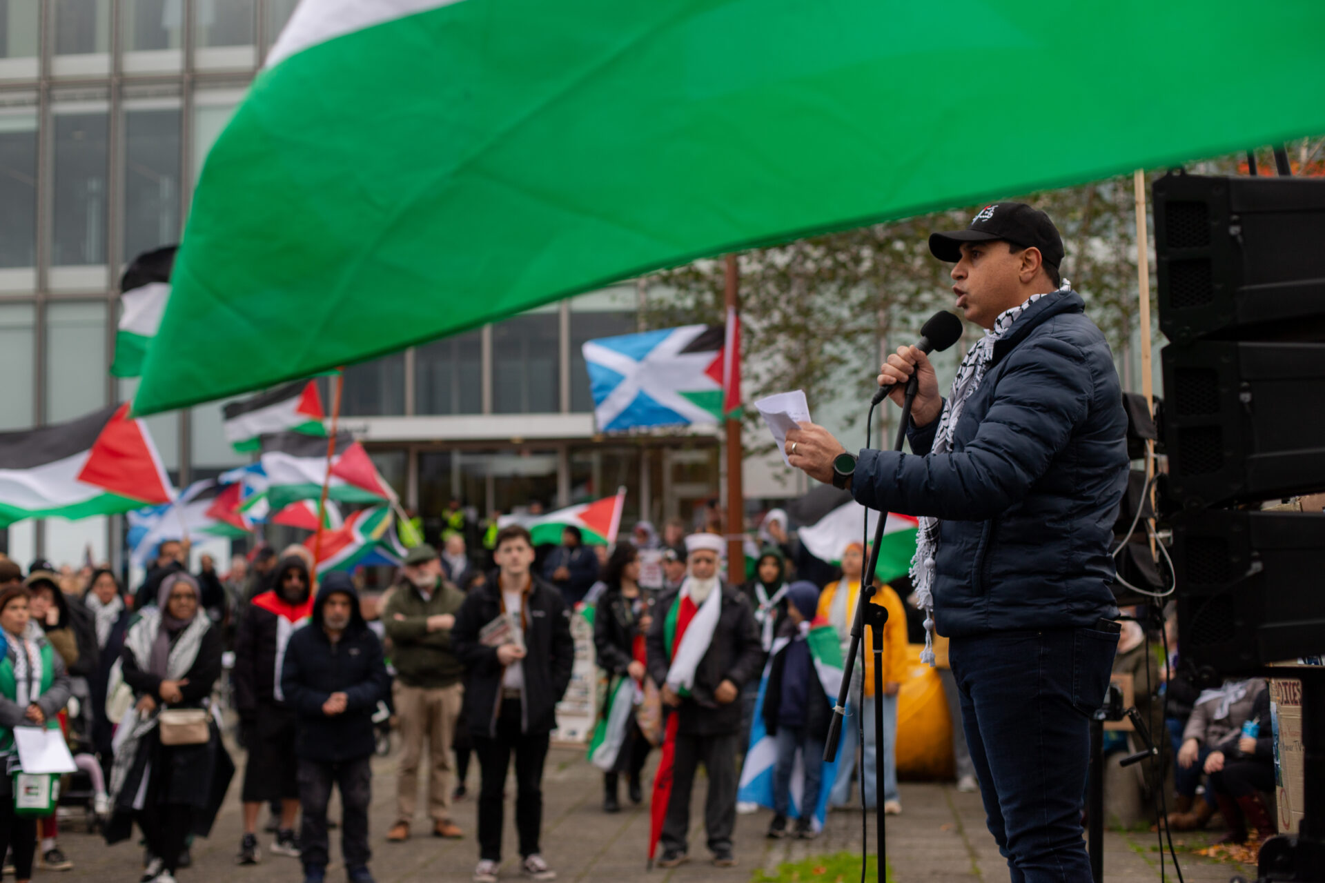 Dr Ibrahim Khadra, chair of the Scottish Palestinian Community, addresses a pro-Palestinian crowd outside the BBC building in Glasgow on October 26, 2024. Emphasising the impact of ongoing global demonstrations, Khadra claimed: “The tide is turning because of the millions of people taking to the streets.”