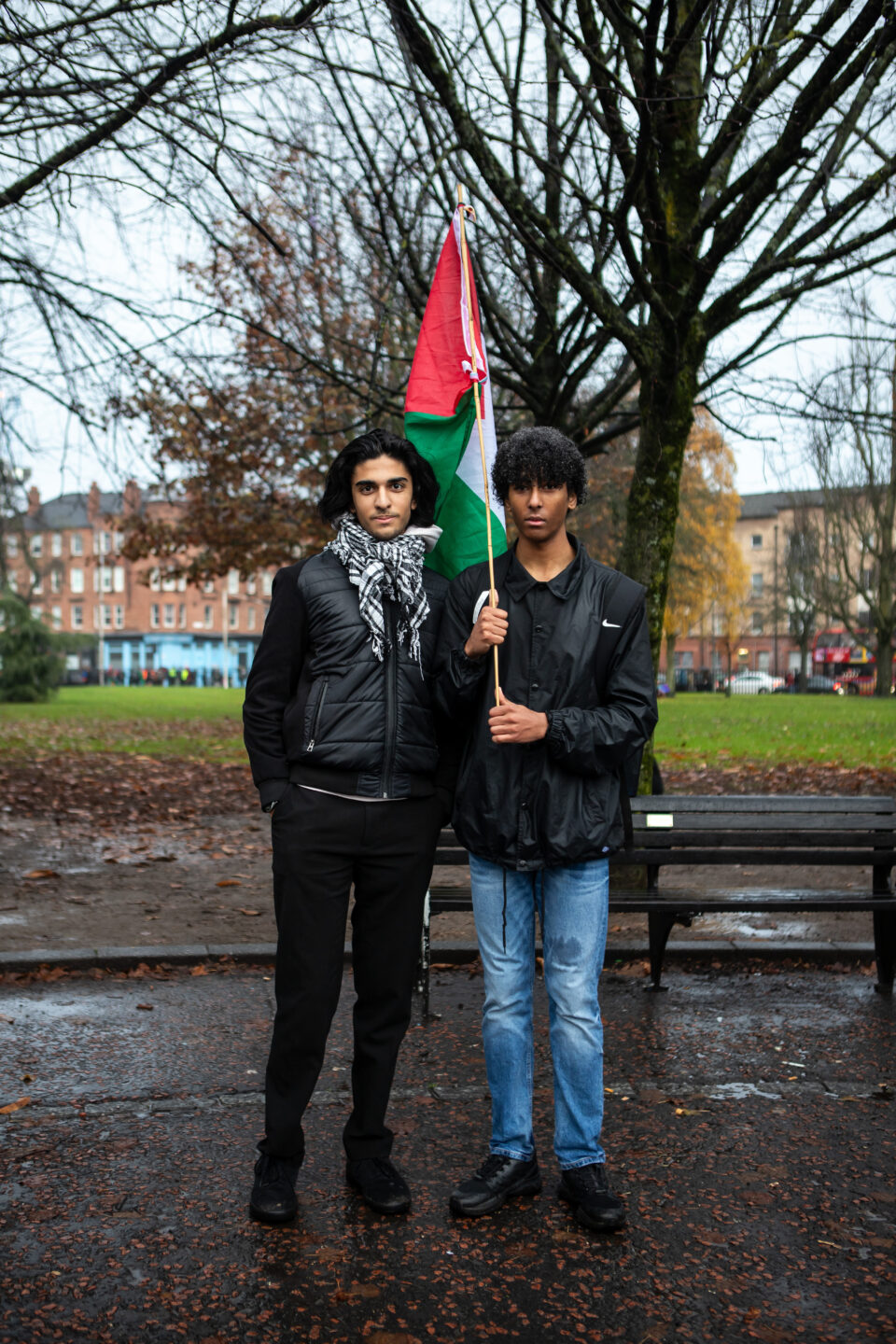At a pro-Palestinian march in Glasgow Green on November 18, 2023, Saroush and Nabil pose for a portrait. Saroush stated: “We are all human, and we often take our human rights for granted. If they are being denied in one part of the world, it is our obligation to stand up and fight for those rights everywhere else.”