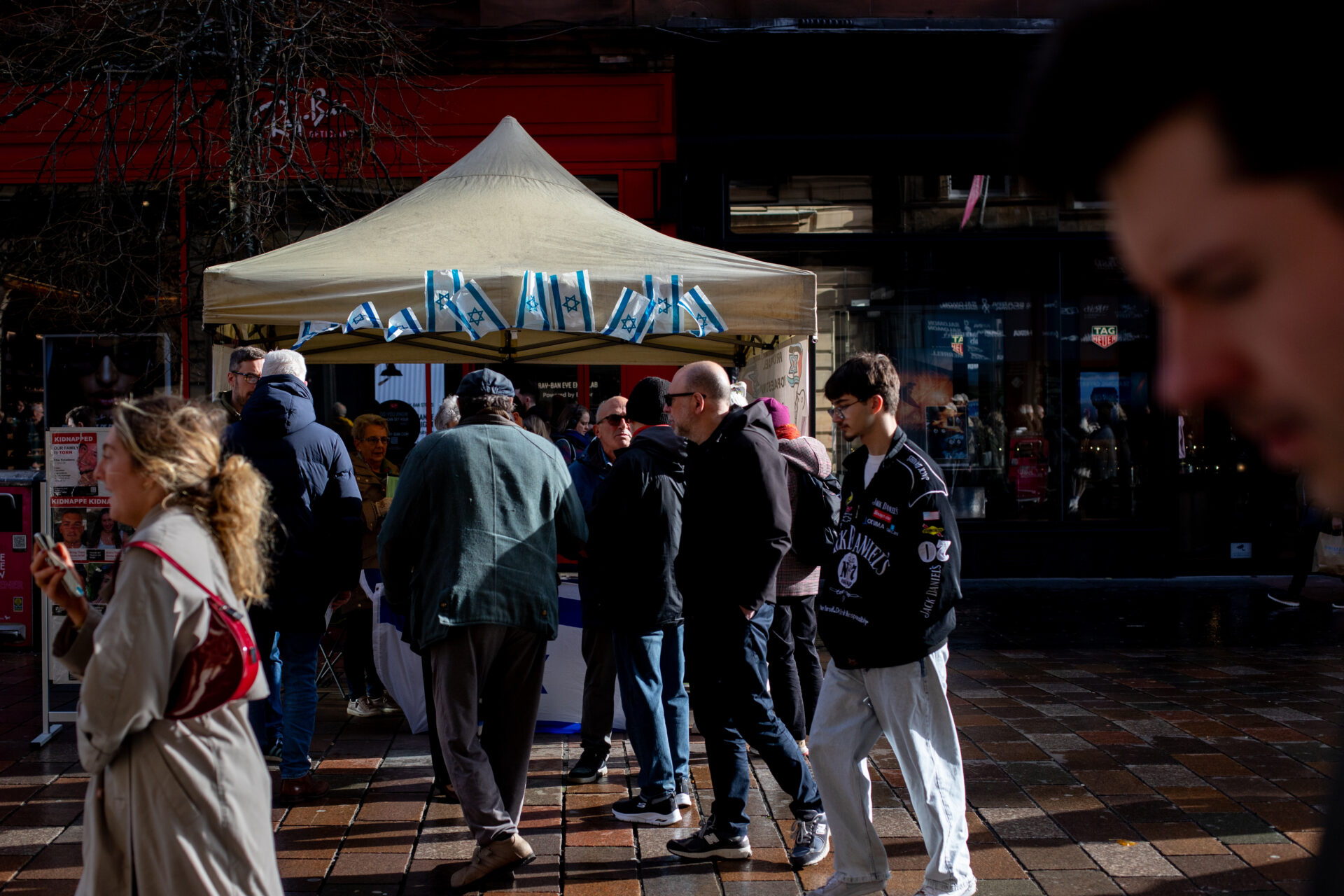 Activists engage with passersby at the Glasgow Friends of Israel stall on Buchanan Street on October 26, 2024. “Most people give us a thumbs up; we have the silent majority,” says Sammy, chairman of Glasgow Friends of Israel. “Most people know that the only solution is peace. They just talk about hate,” he claims, regarding pro-Palestinian protesters.