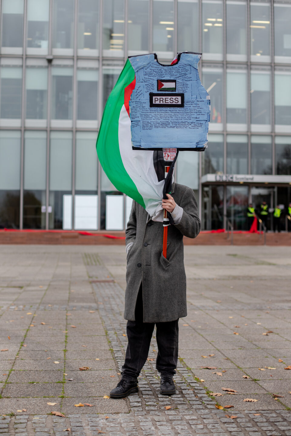 At a pro-Palestinian march outside the BBC building in Glasgow on October 26, 2024, a protester poses for a portrait. He was carrying a sign featuring a press jacket, calling attention to what activists claim are “blatant omissions, false framing, and gross bias” in British media coverage, according to a Glasgow Genocide Emergency Committee statement.
