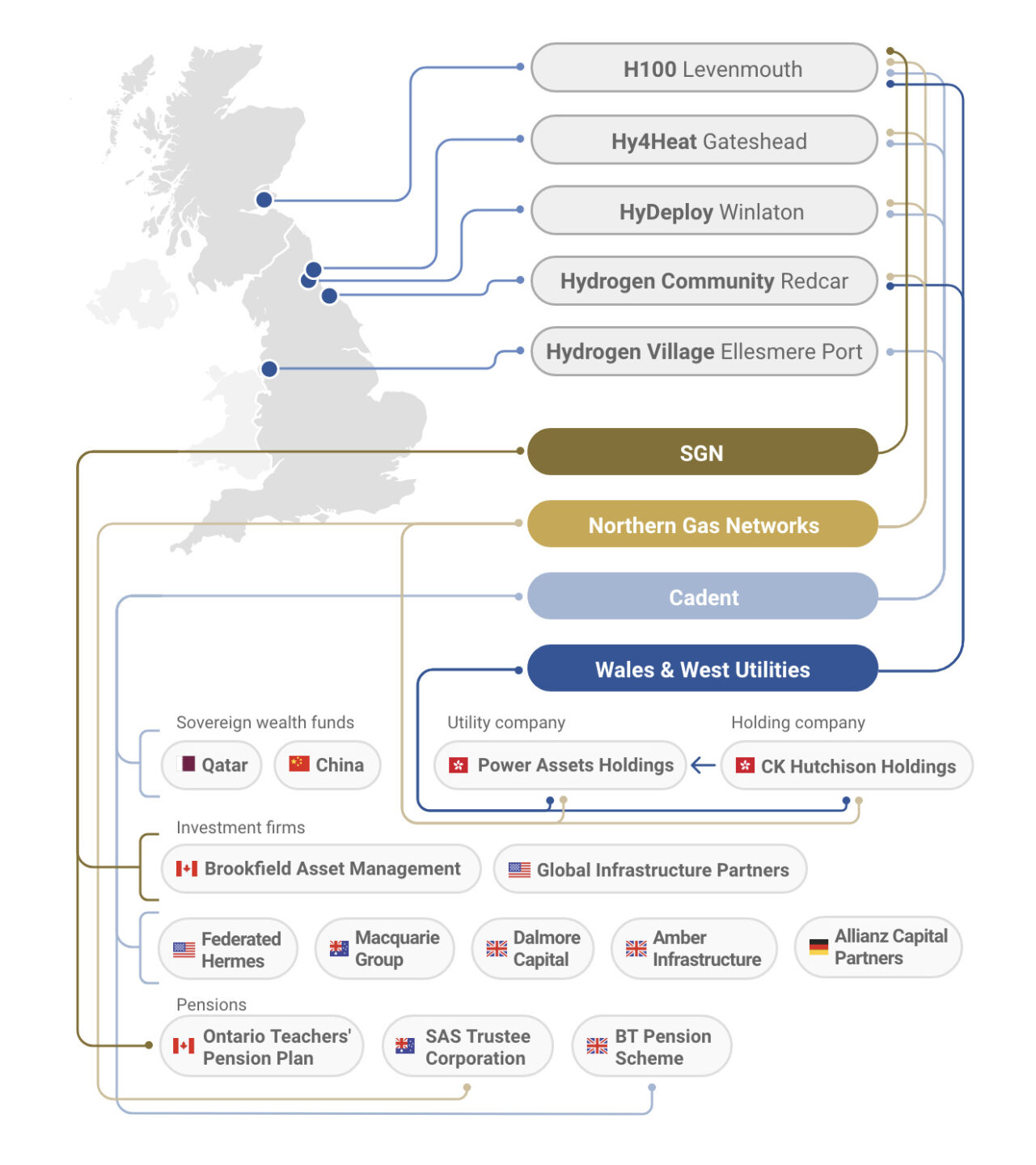 Amber InfrastructureDalmore CapitalMacquarie GroupFederated HermesAllianz Capital PartnersOntario Teachers’ Pension PlanCK Hutchison HoldingsBrookfield Asset ManagementGlobal Infrastructure PartnersBT Pension SchemeSAS Trustee CorporationChinaQatarInvestment firmsSovereign wealth fundsHolding companyPensionsWales & West UtilitiesCadentNorthern Gas NetworksSGNH100LevenmouthGatesheadHy4HeatWinlatonHyDeployHydrogen CommunityRedcarEllesmere PortHydrogen VillagePower Assets HoldingsUtility company