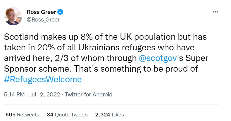 Ross Greer’s tweet was posted after the announcement of the super sponsor scheme being paused, and claimed Scotland had taken in 20 per cent of all the Ukrainian refugees that had arrived in the UK, despite making up only eight per cent of the population.