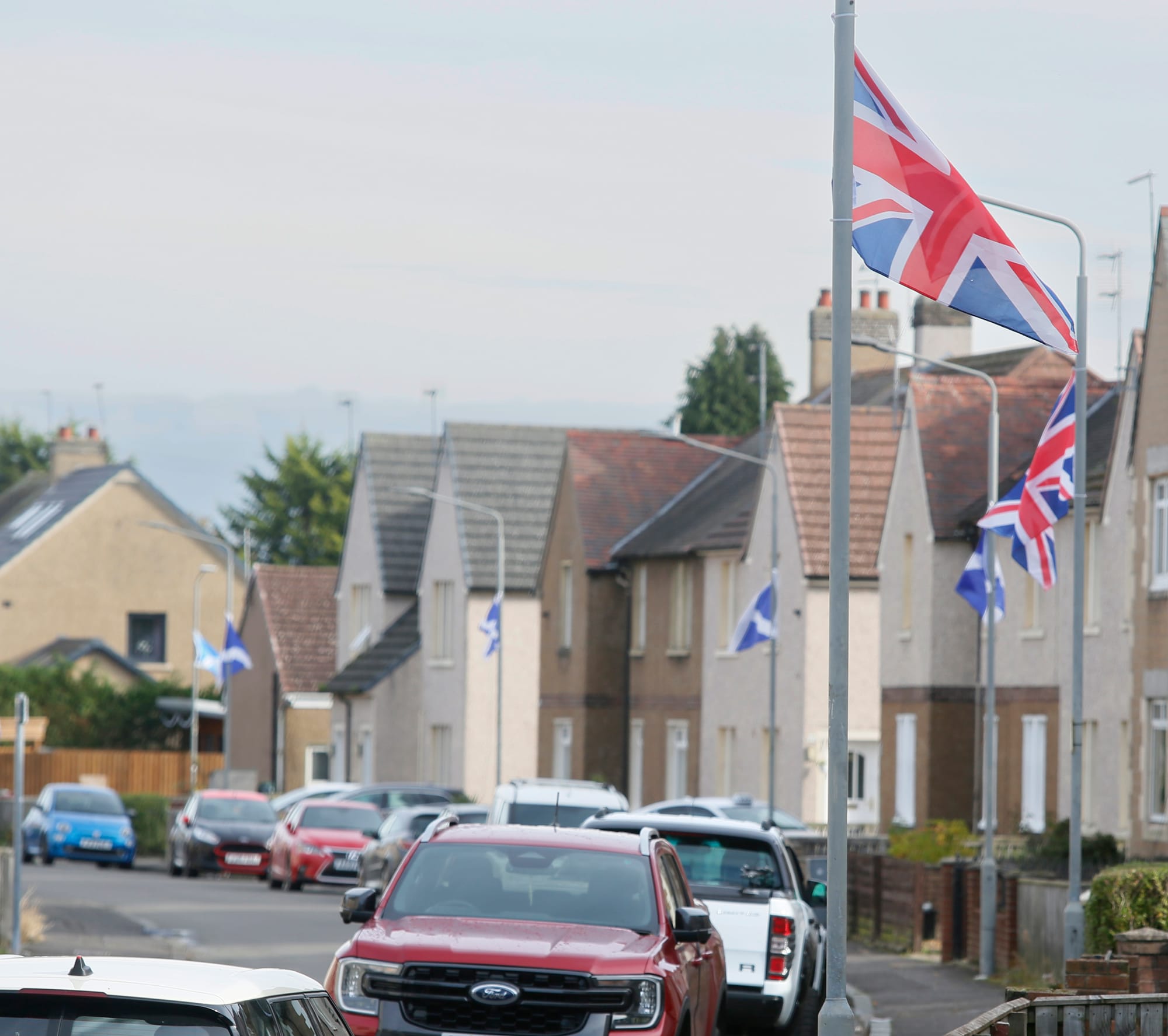 Driving into Falkirk from the east, the politics are visible. As we pass a housing scheme known locally as ‘The Bog”, union flags and saltires on lampposts flutter in the wind, symbolism that smacks of loyalist estates in Northern Ireland. Our destination is the Cladhan Hotel, a dull grey and white block of a building, on two levels, close to the town centre with a line of swaying green trees at its back. It faces high rise flats where union flags stare back, and across from the hotel, where anti-migrant protestors gather, lies a sign that reads: “Call them what they are: Illegal economic migrants.”