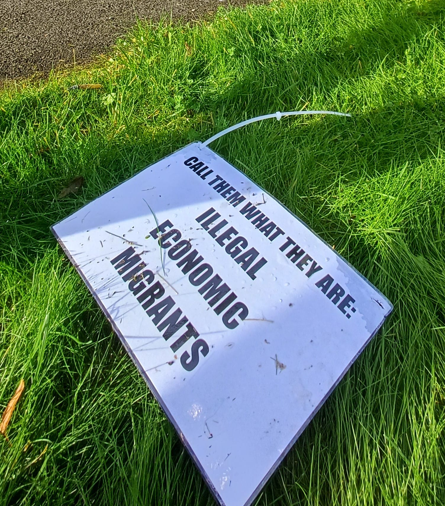 She claims there was another incident when three men who’d been praying at a mosque were targeted on Constitution Street by masked youths on scooters who carried backpacks full of stones. The men ran back to the mosque and were unhurt, she says, but the attackers followed and the police were called. Other incidents include a Chinese family allegedly being spat at in hospital and an Iraqi businessman challenged by a teenager who said ‘did you come here by boat?’. “I mean what is going on?,” Amy says. “This is happening more often. We’ve had ‘white power’ shouted at demos and banners with the 14 words”. This refers to a white supremacist slogan 14 words long: ‘We must secure the existence of our people and a future for white children’ – The Ferret has seen evidence of this at Aberdeen protests.