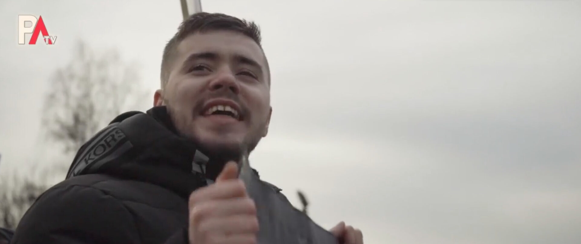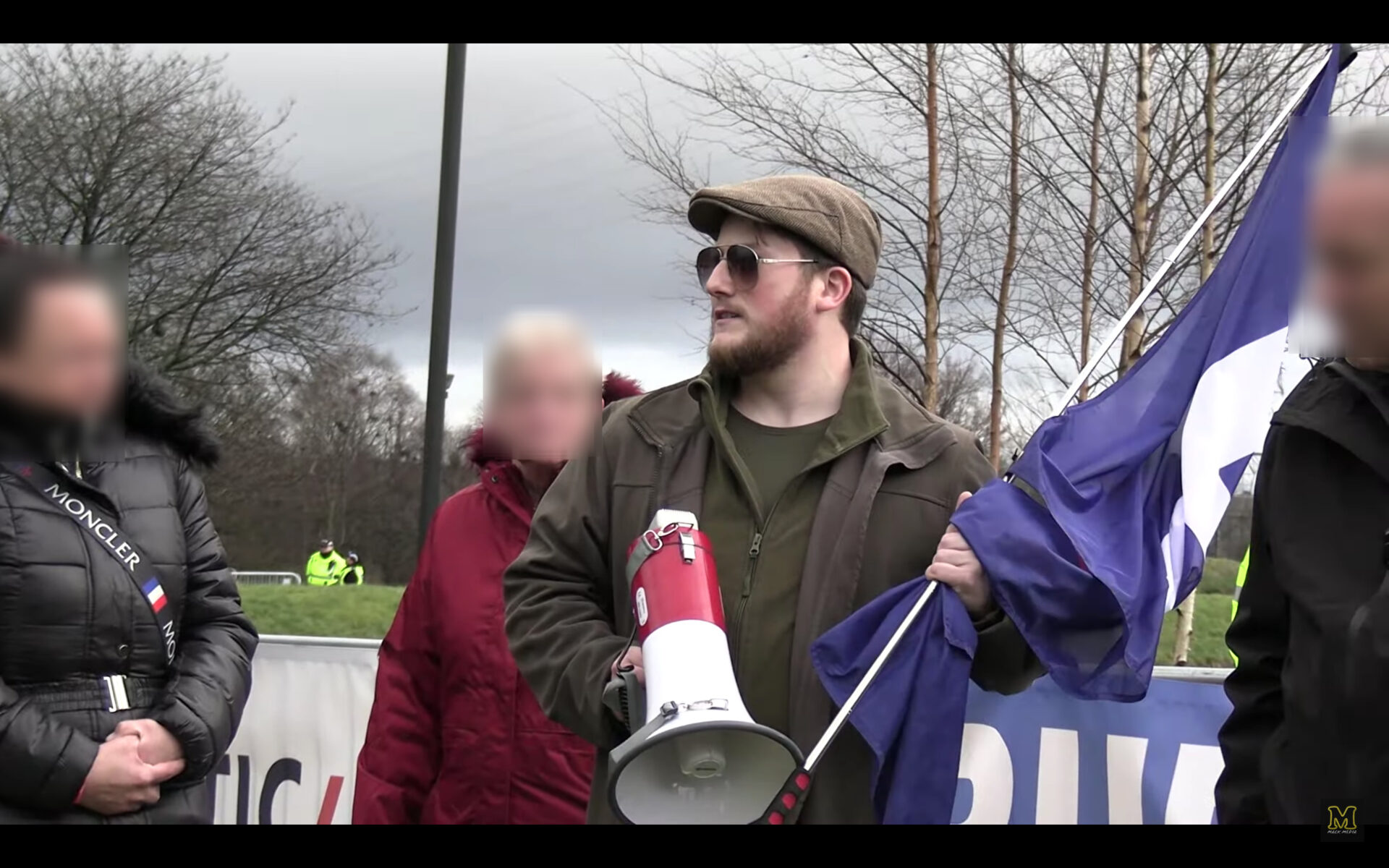 Munro with a PA Scotland flag at the Erskine anti-asylum seeker demo.