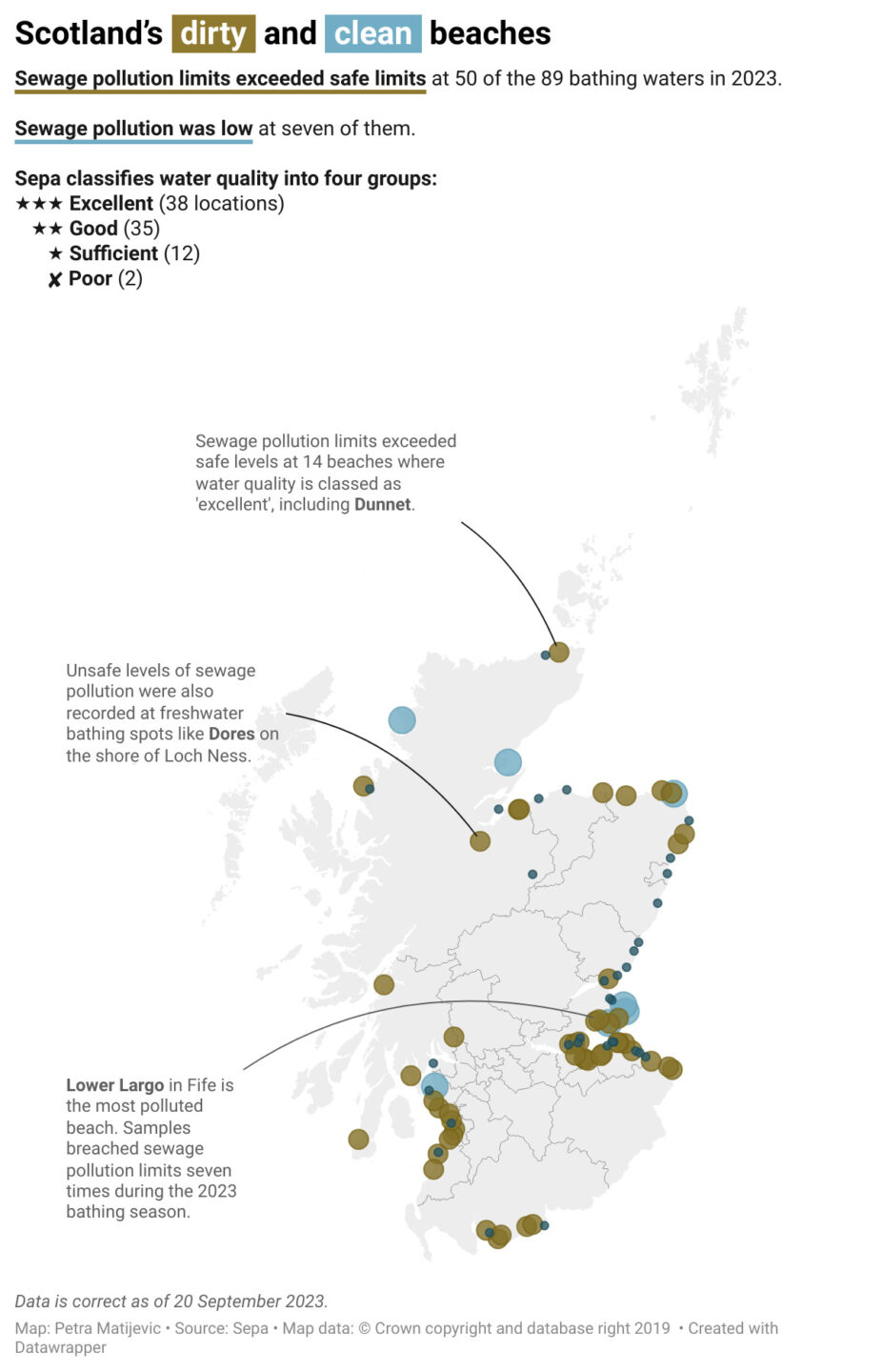 Campaigners told The Ferret it was “disgusting that the majority of Scotland’s most precious blue spaces are being blighted” by sewage pollution. They called for better monitoring and reduction targets to stop sewage being released into bathing waters “for good”.