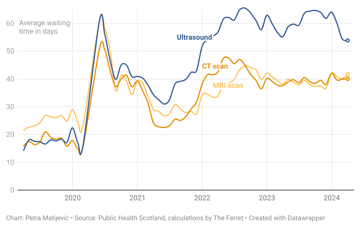The average waiting time for an ultrasound is higher than ever, while the waiting times for CT and MRI scans have stayed above the pre-pandemic rates.