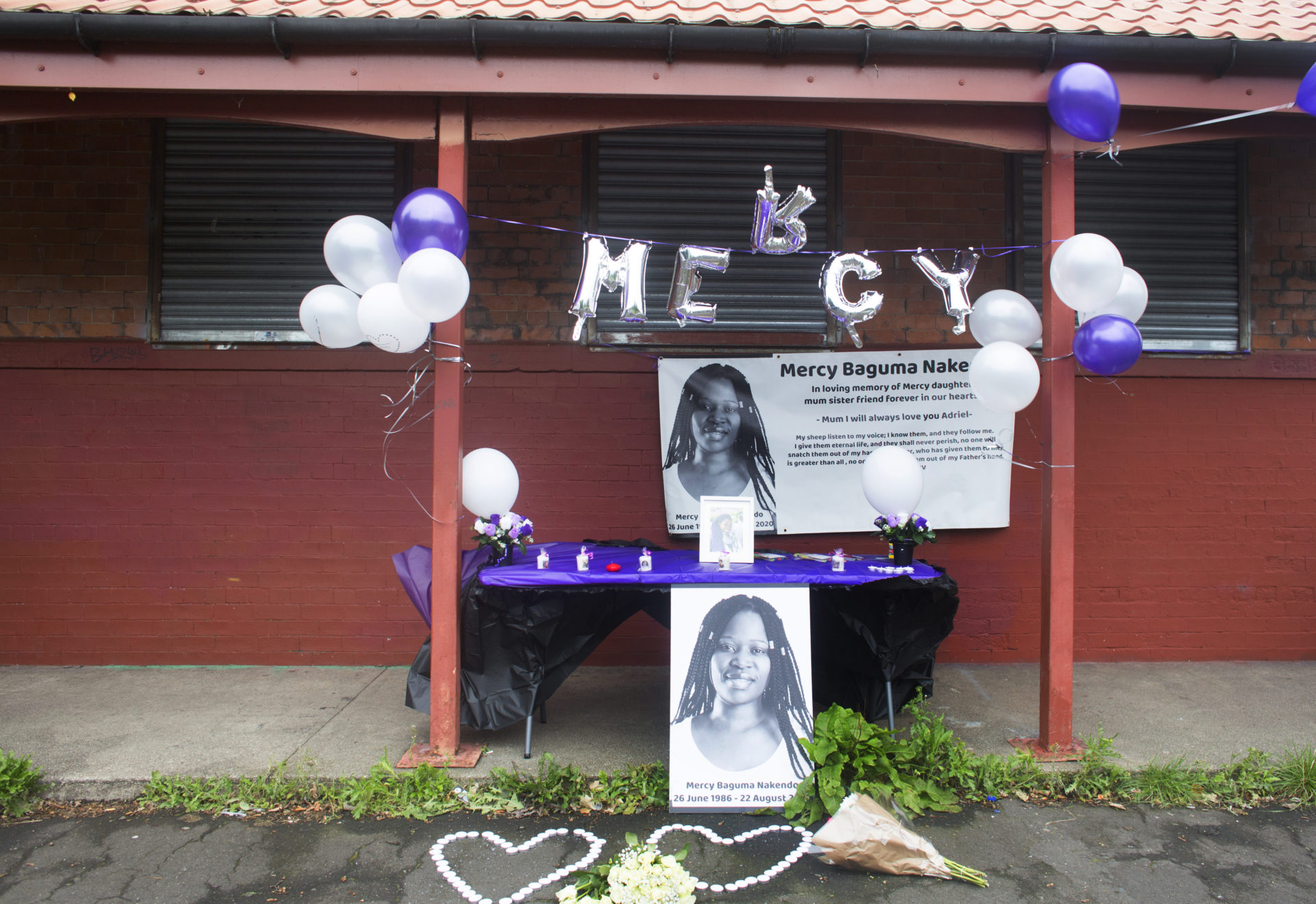 Glasgow shrine for Mercy Baguma who died in her flat. Picture by Angela Catlins