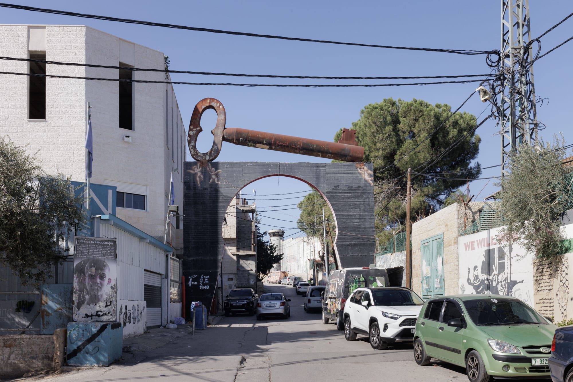 The sculpture of a key at the entrance to the camp evokes the Palestinian call for a right to return to their homelands. Credit: Valerio Muscella