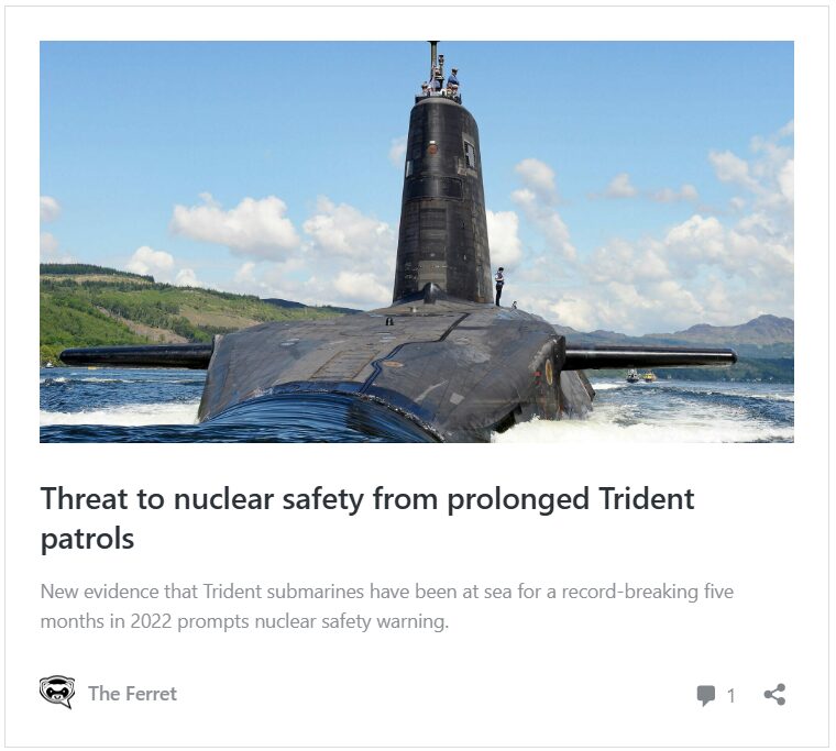 The Ferret reported in December 2022 that nuclear-armed Vanguard submarines were overstretched, having to spend increasingly long periods on patrol at sea. According to The Sun, one was recently on patrol for more than six months and ran so low on food that sailors were ordered to share their rations.