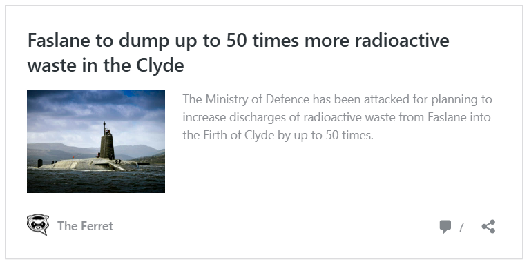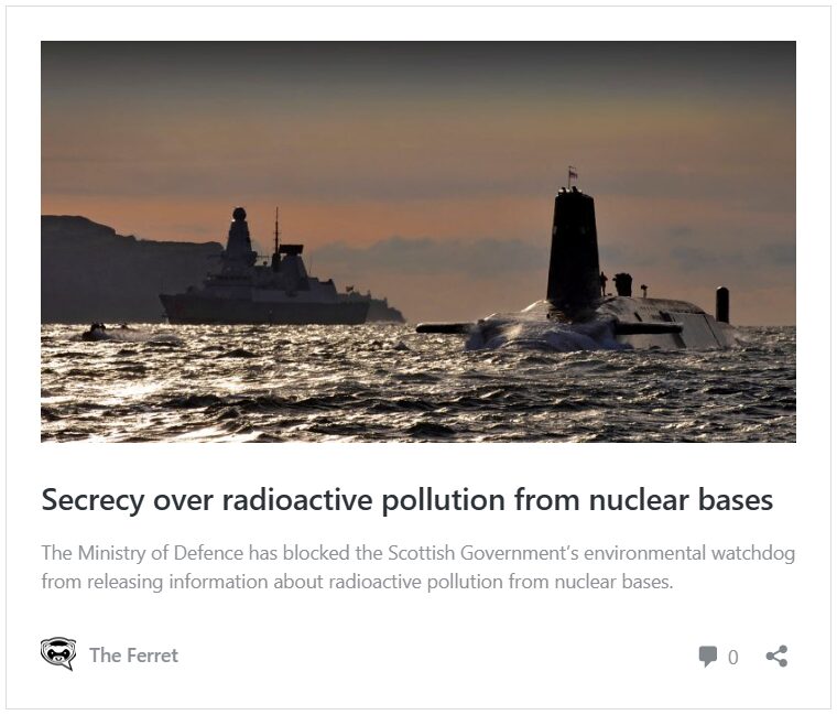 The Ferret reported on 22 October 2024 that the MoD had blocked Sepa from releasing unspecified information about “environmental issues with radioactivity” from Coulport and Faslane since 2016. We have appealed to the Scottish Information Commissioner, David Hamilton.