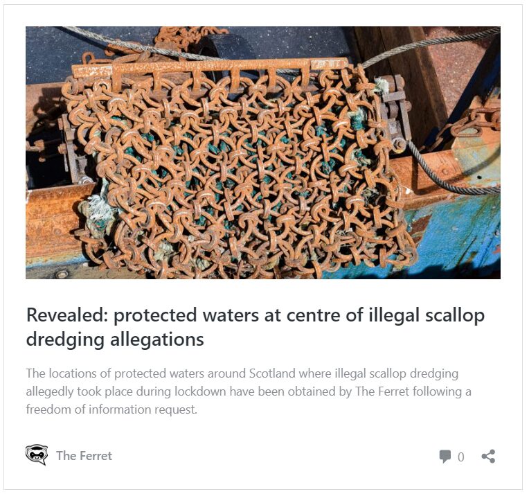 Scallop dredging is an issue The Ferret has covered since 2015. In 2023, for example, we revealed that evidence of scallop dredging had been found inside an Orkney MPA at Papa Westray. Two years earlier, we reported that six fishing boats had been investigated for illegal fishing since March 2020. Dredgers allegedly targeted the Firth of Lorn, a special area of conservation in the Southern Hebrides protected for rocky reef habitats which support species that are “amongst the most diverse in both the UK and Europe”.