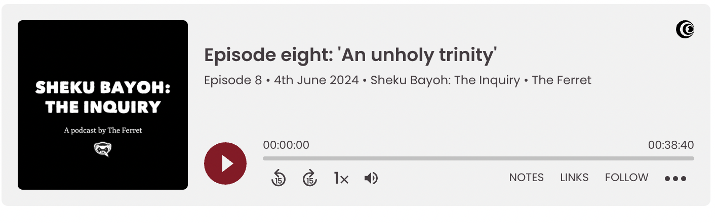Sheku Bayoh: The Inquiry was a finalist for the British Journalist Awards, the Amnesty Media Awards and won runner-up for Podcast of the Year at the Scottish Press Awards 2024.