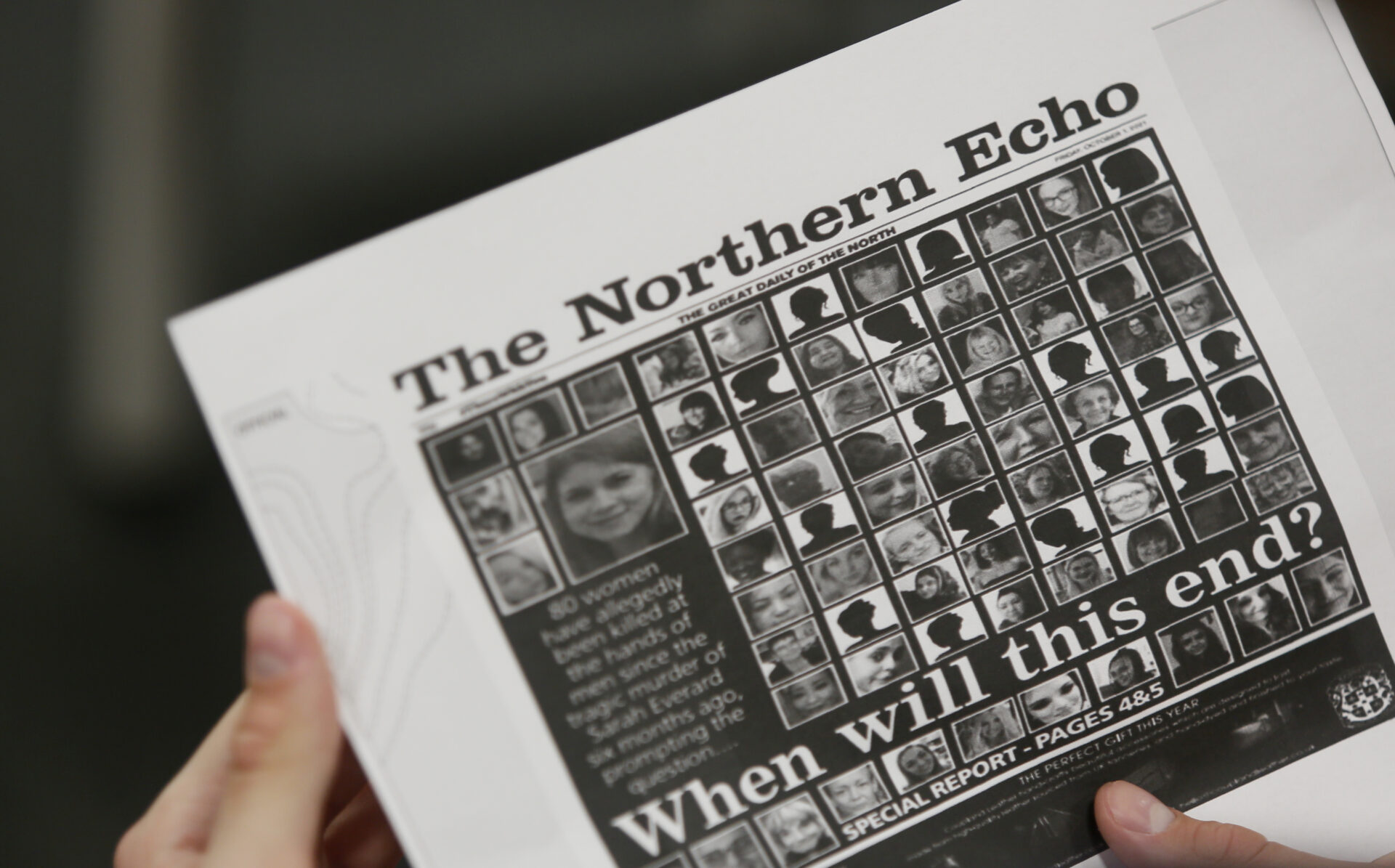 Corbett passes around a front page of the Northern Echo from September 21. It is covered in small square images of some of the 80 women allegedly killed by men in the six months following Everard’s death.
