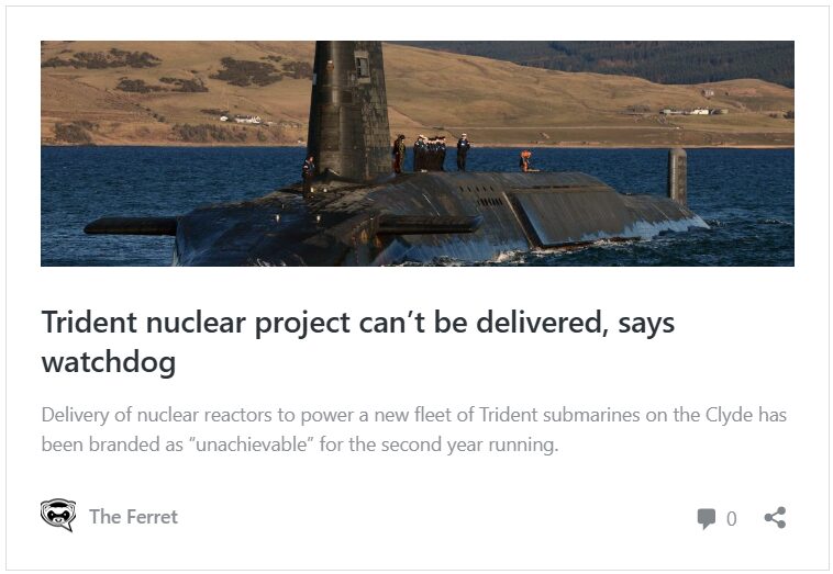 The SNP highlighted the MoD’s record of radioactive leaks and rising costs on the Clyde. “It is disappointing but not surprising that the MoD seems to be totally unable to manufacture a replacement for Trident in a timely or cost-effective manner,” said SNP MSP Keith Brown.