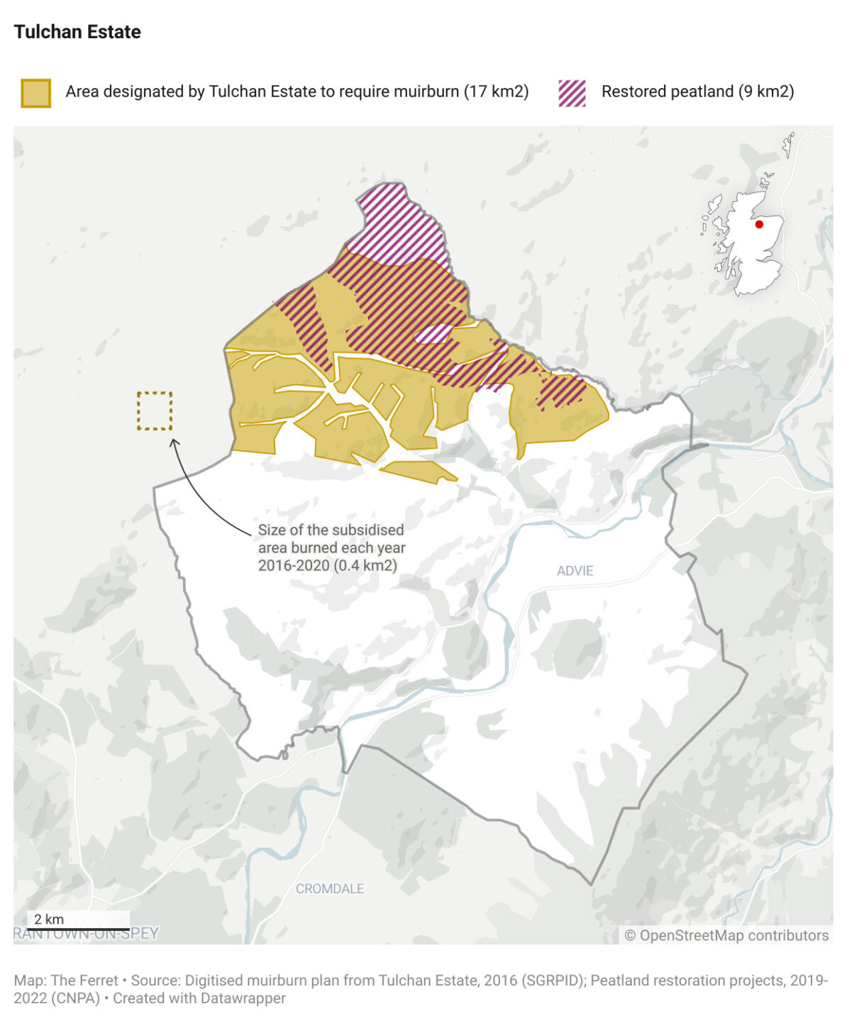 The Ferret’s analysis of government grants — using data obtained through freedom of information requests — found that Tulchan Estate, in the Highlands, received Scottish Government funds that would have allowed them to both burn and restore areas of the estate. Tulchan Estate is owned by a billionaire and owned by a company registered in a tax haven.