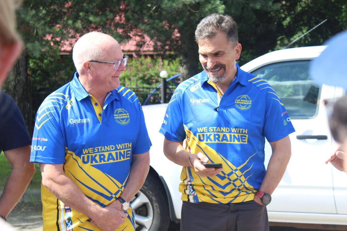 Fellow rugby legend Colin Deans (L) with Tukalo (R) outside Lviv