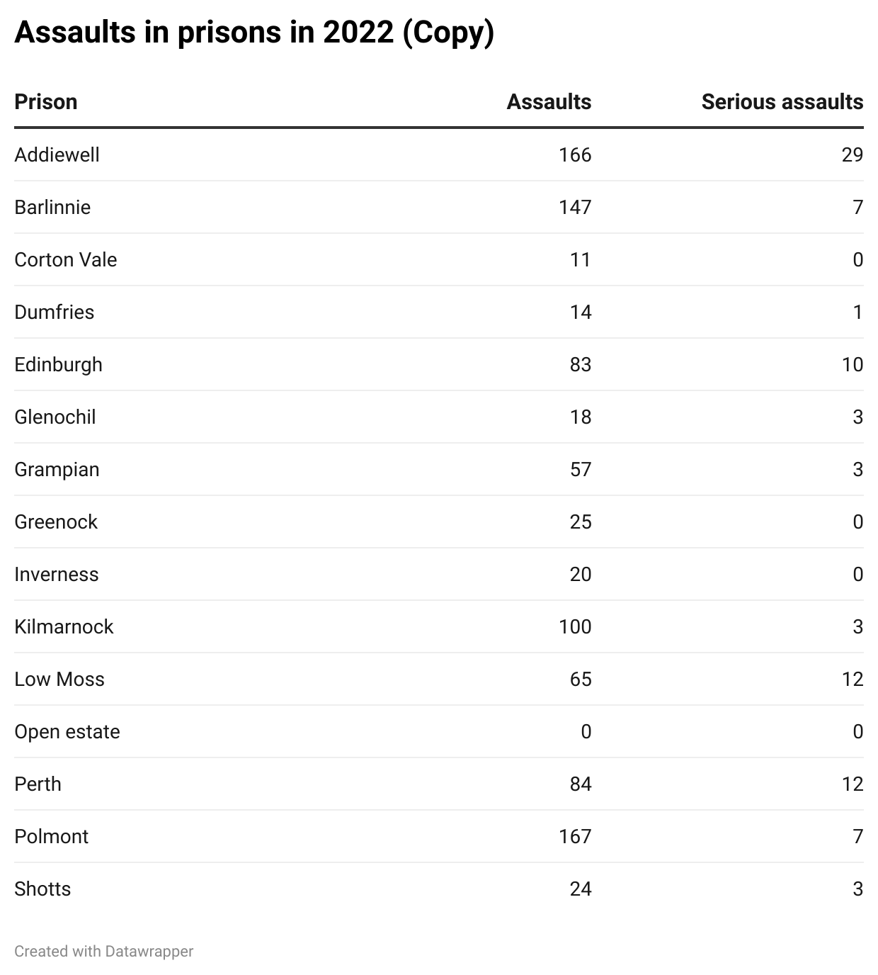At Addiewell 29 of the assaults were recorded as “serious”, more than four times the number in this category at Barlinnie.